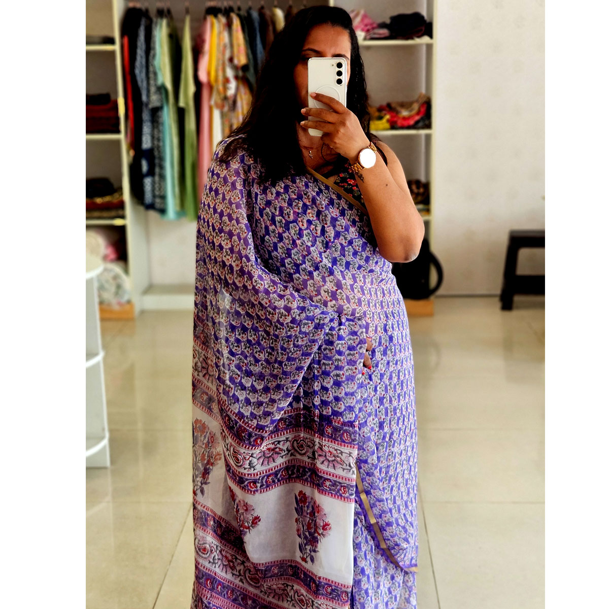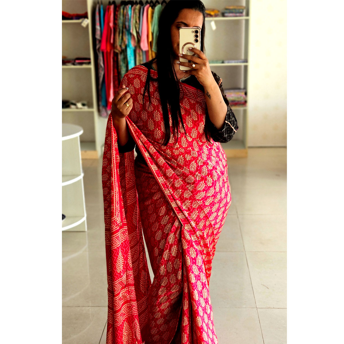 Experience the "Raabata Chiffon Saree" where chiffon fabric meets floral handblockprints, crafting a story of elegance and allure. Perfect for captivating gatherings - fall in love with every elegant drape.