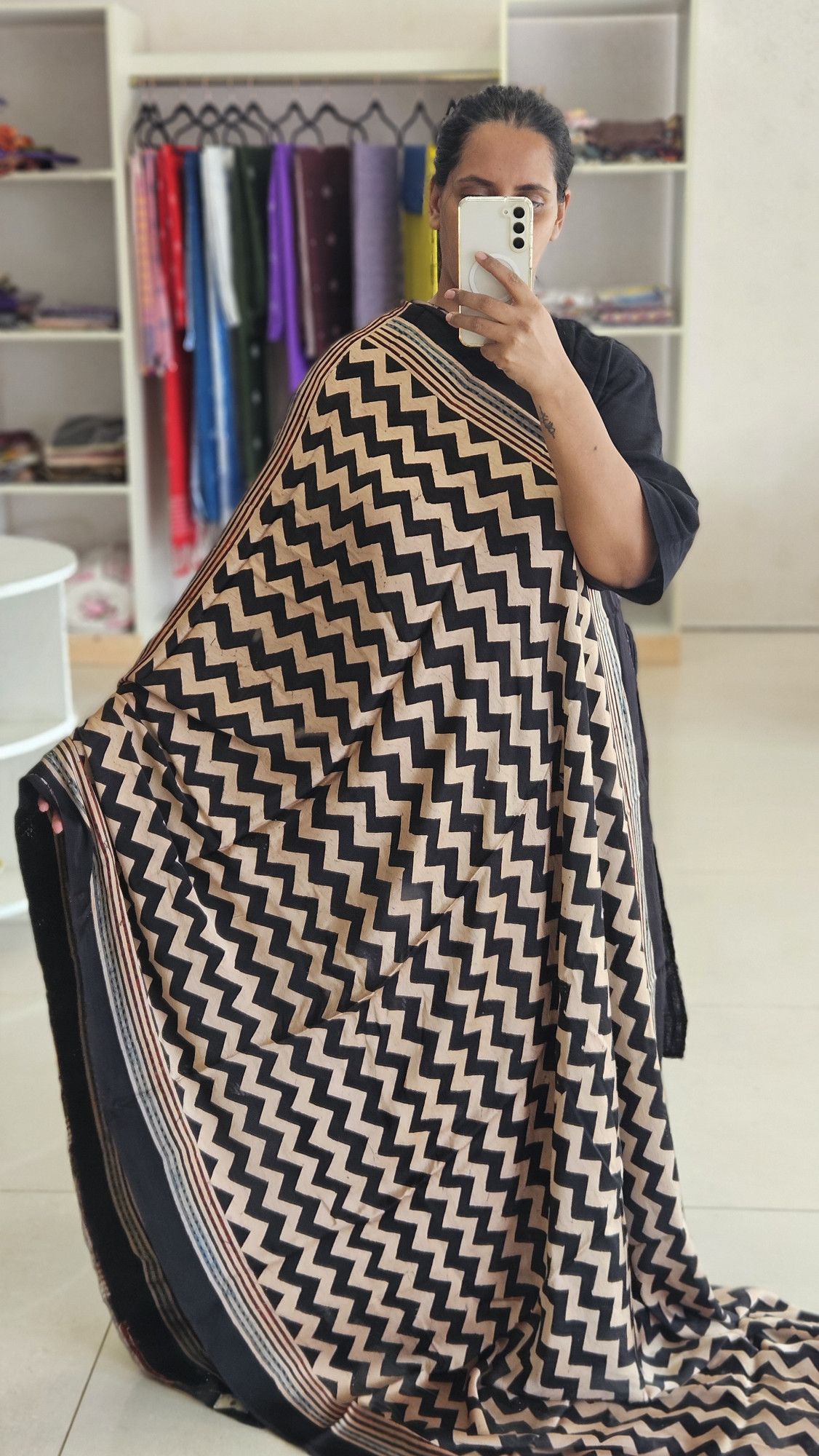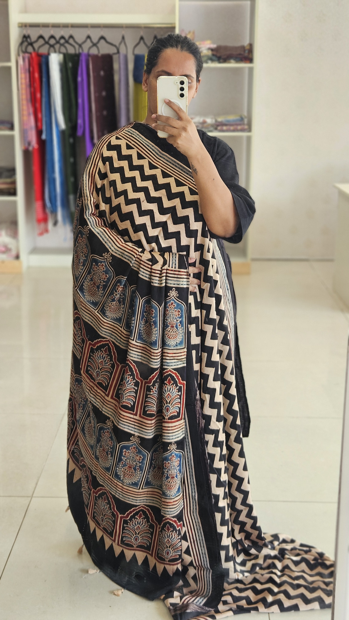 COMES WITH ITS OWN BLACK AJRAKH MODAL SILK BLOUSE PIECE 90CMS.