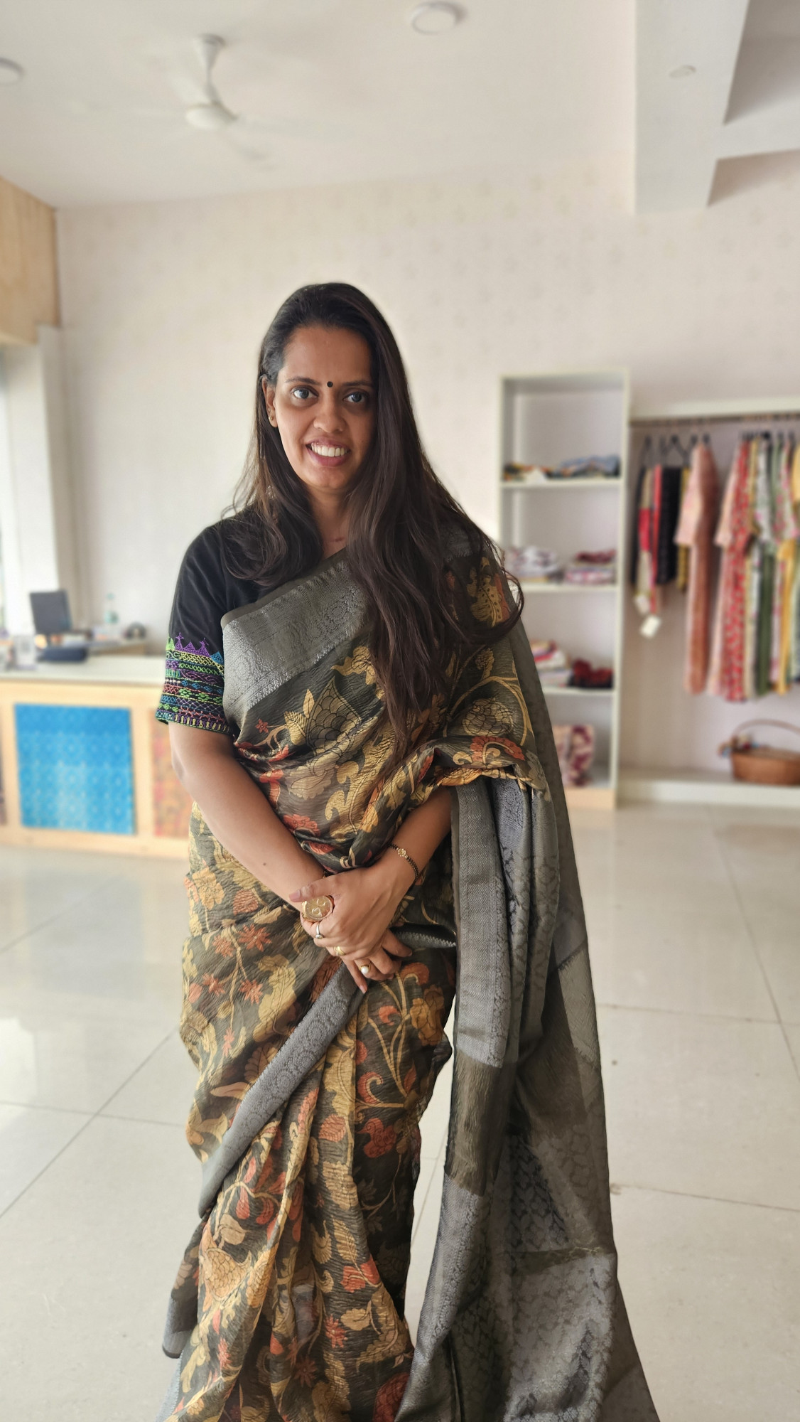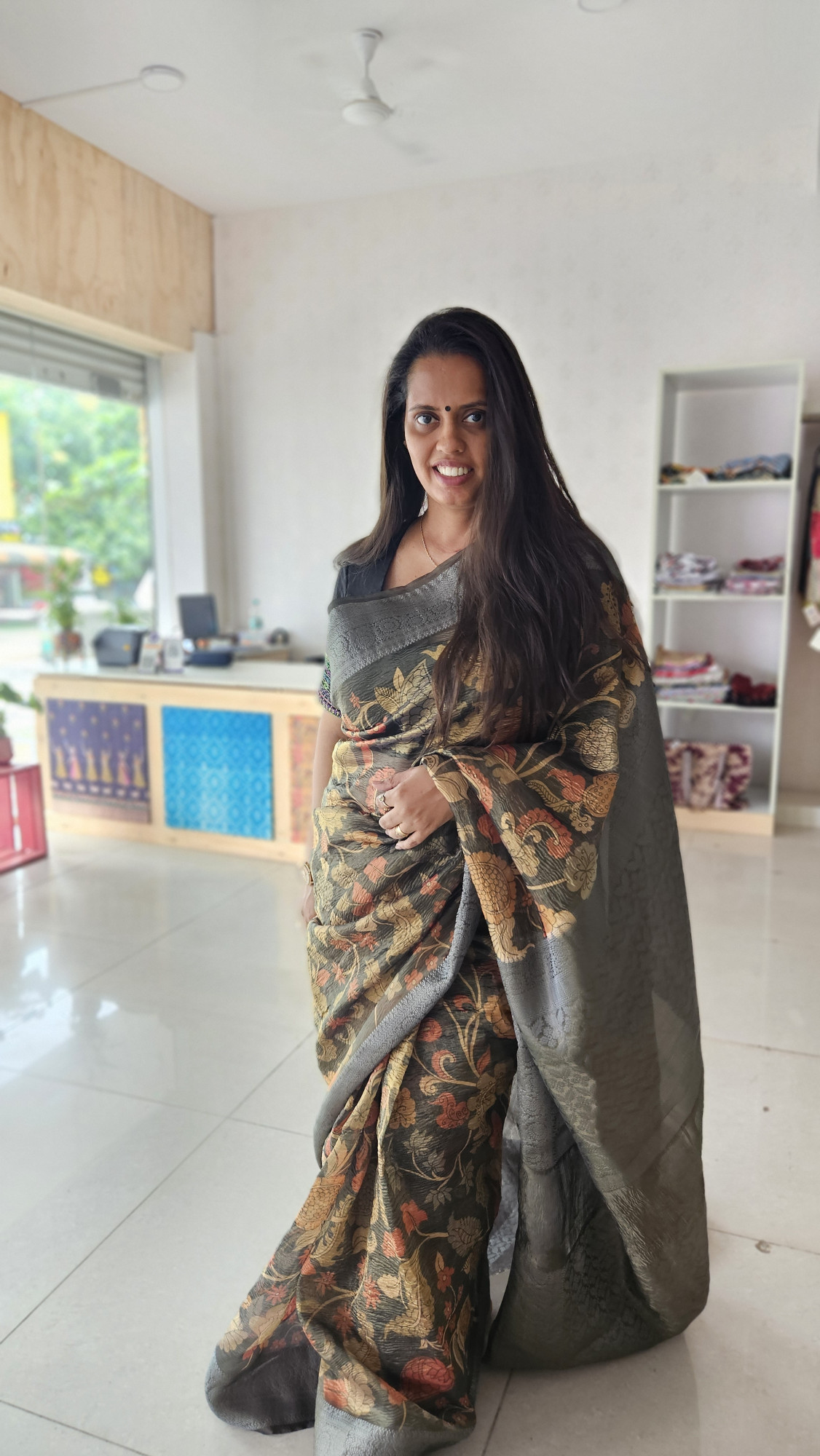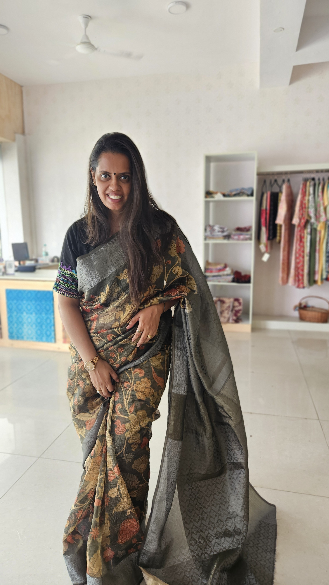 BLACKKALAMKARI DIGITAL PRINTED CRUSH TISSUE SILK SAREE WITH ZARI BORDER.