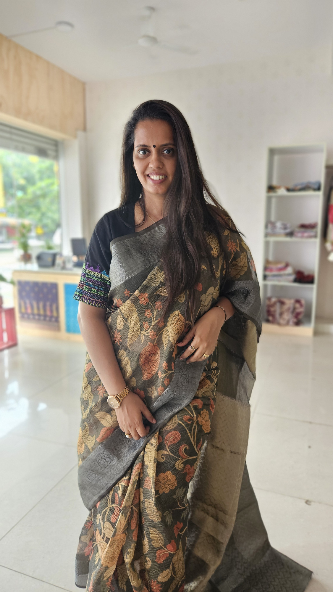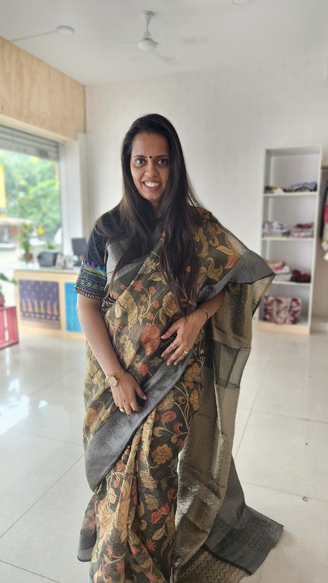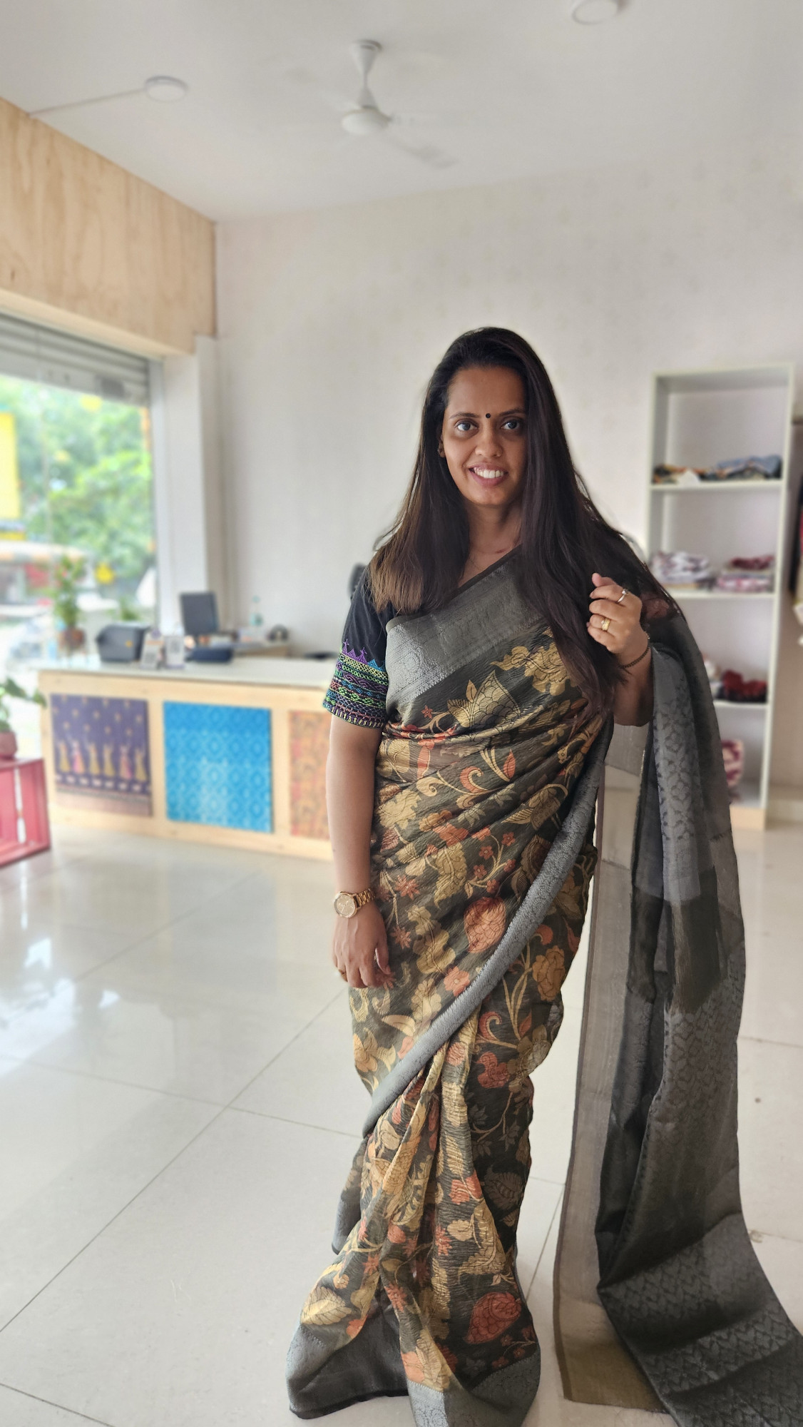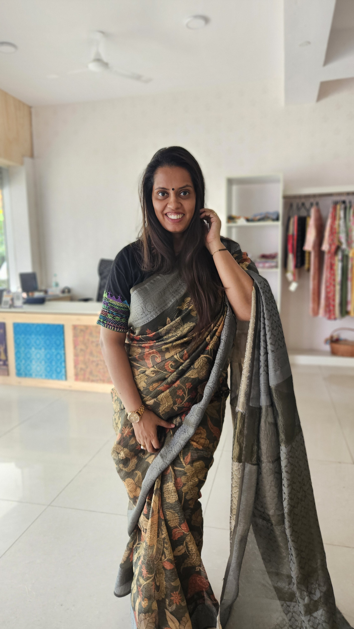 BLACKKALAMKARI DIGITAL PRINTED CRUSH TISSUE SILK SAREE WITH ZARI BORDER.