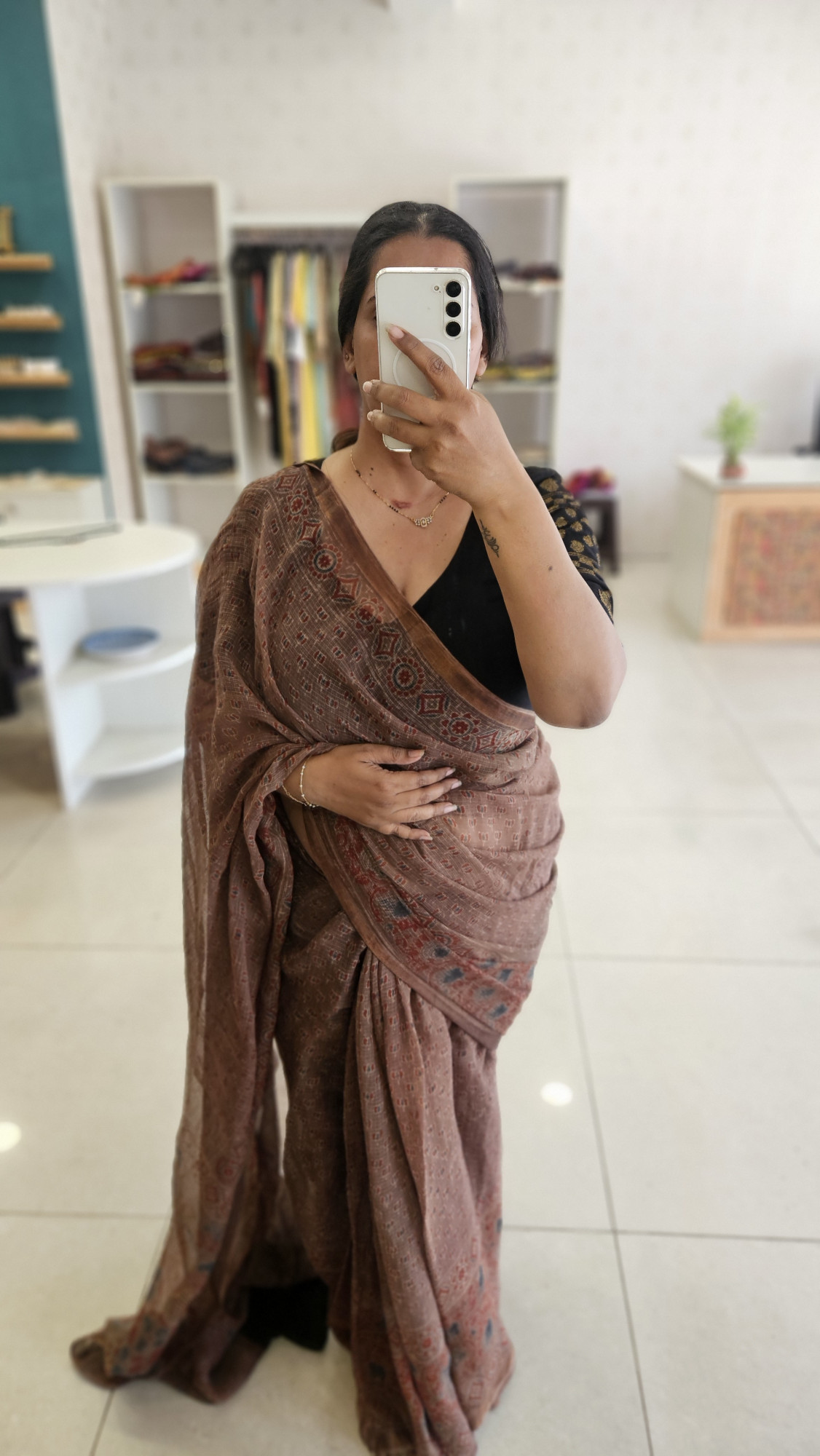 BROWN AJRAKH HANDBLOCK PRINT KOTA SAREE, WITH BROWN BLOCKPRINTED PALLU.