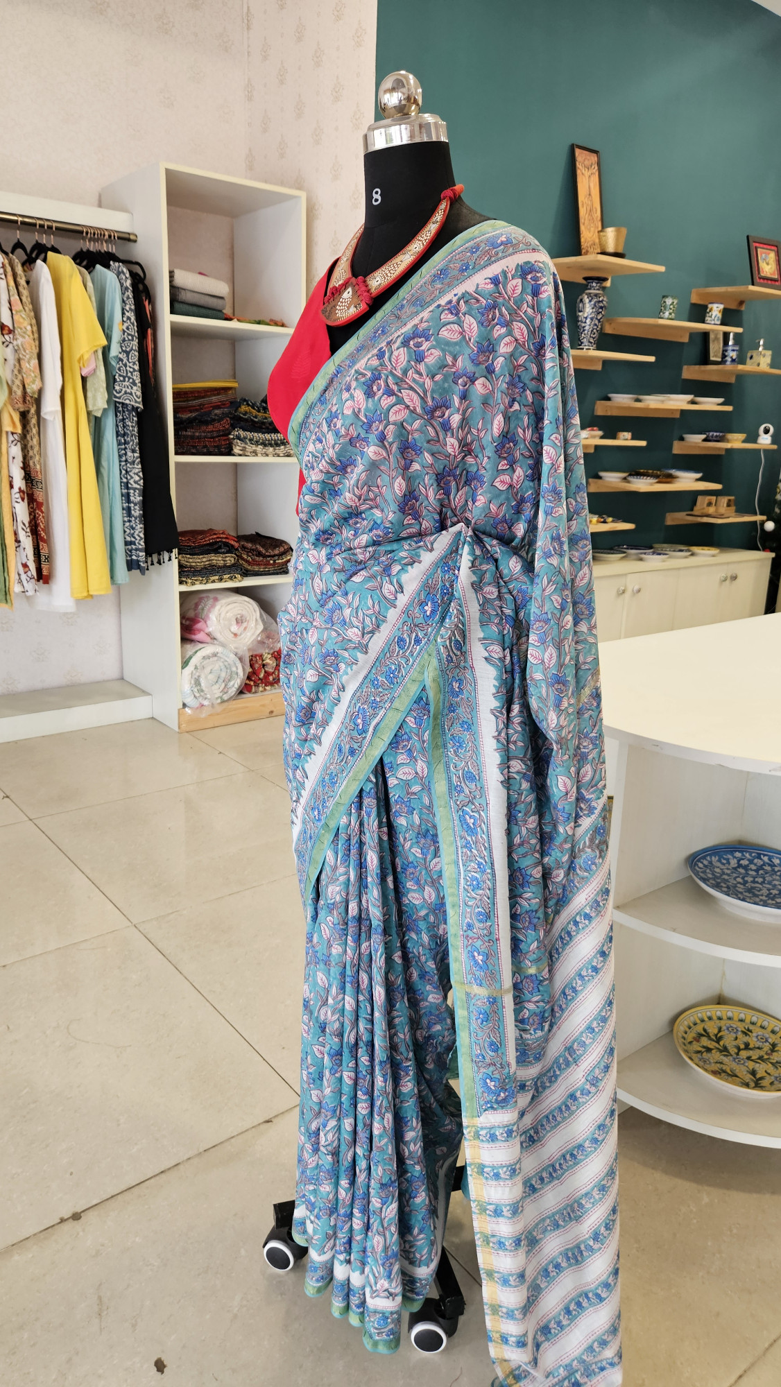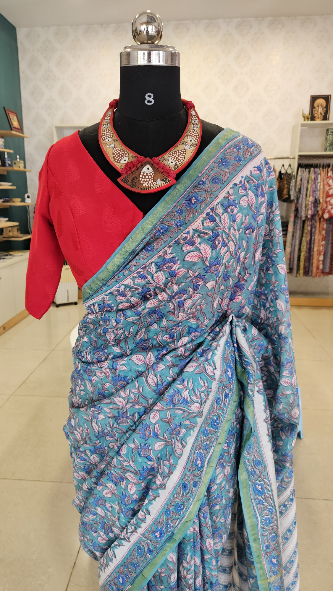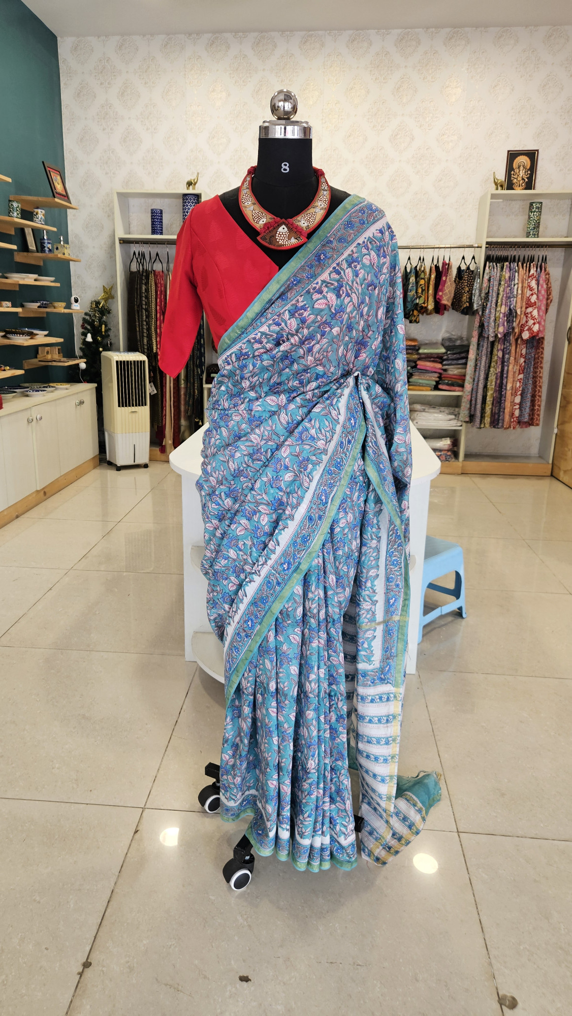 BLUE FLORAL CHANDERI HANDBLOCK PRINT SAREE.