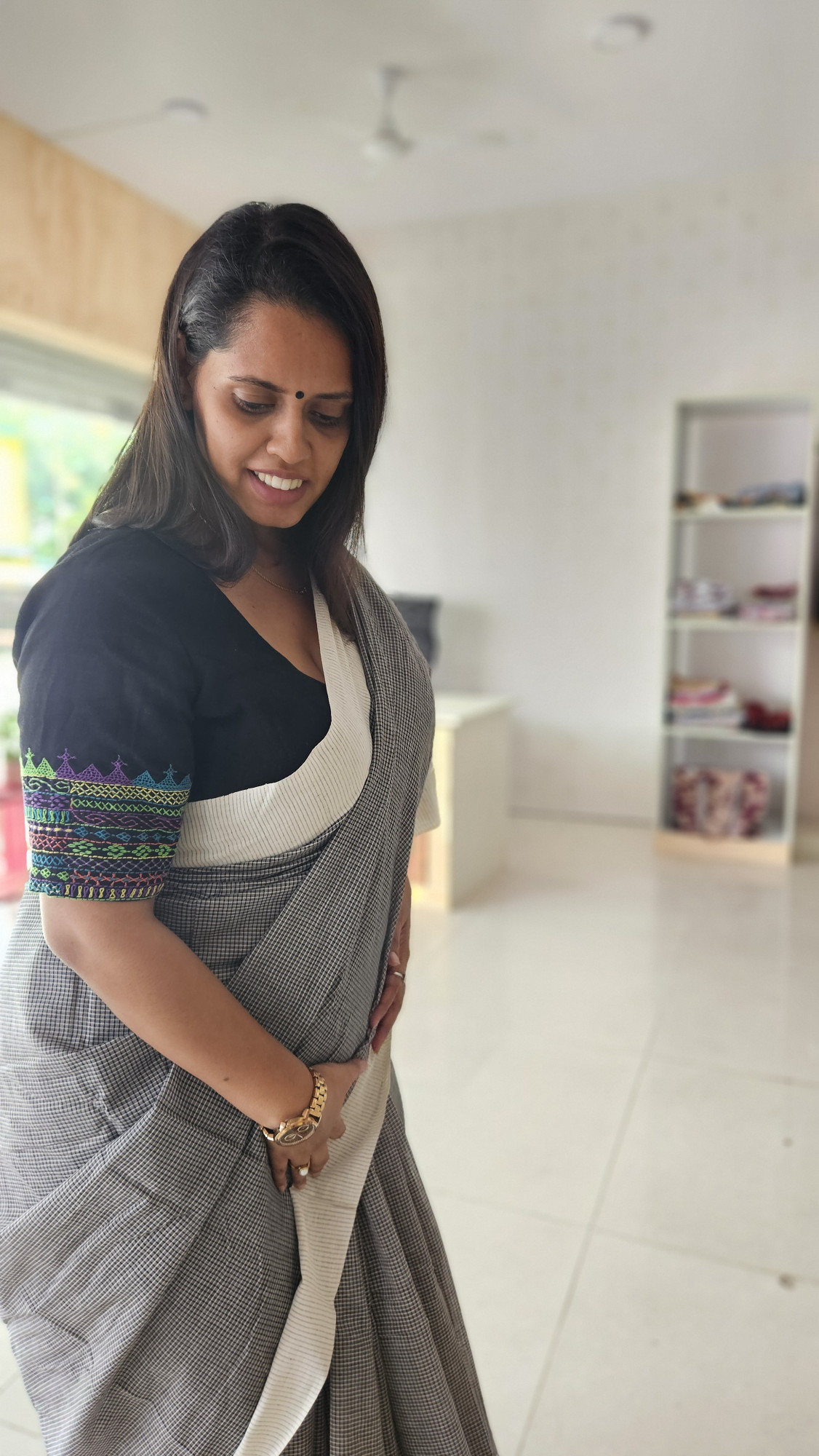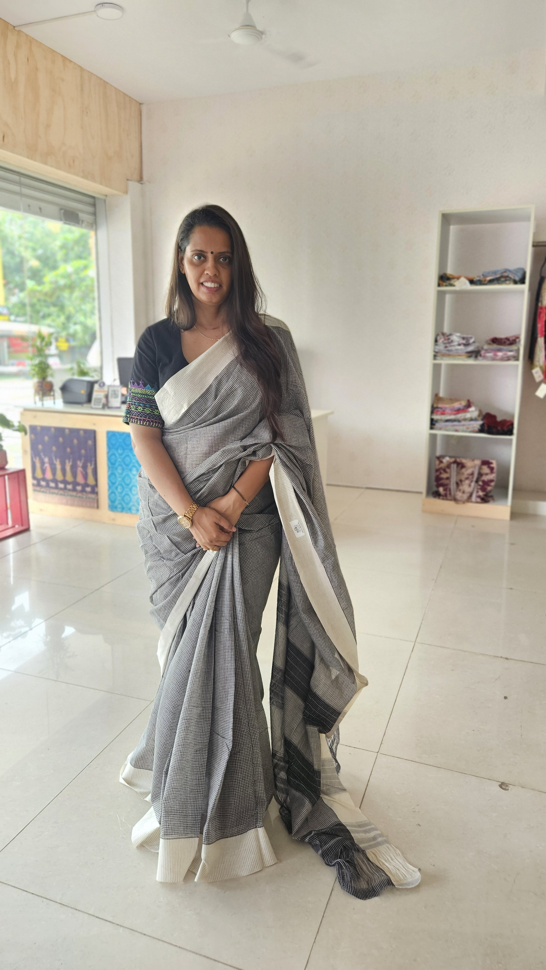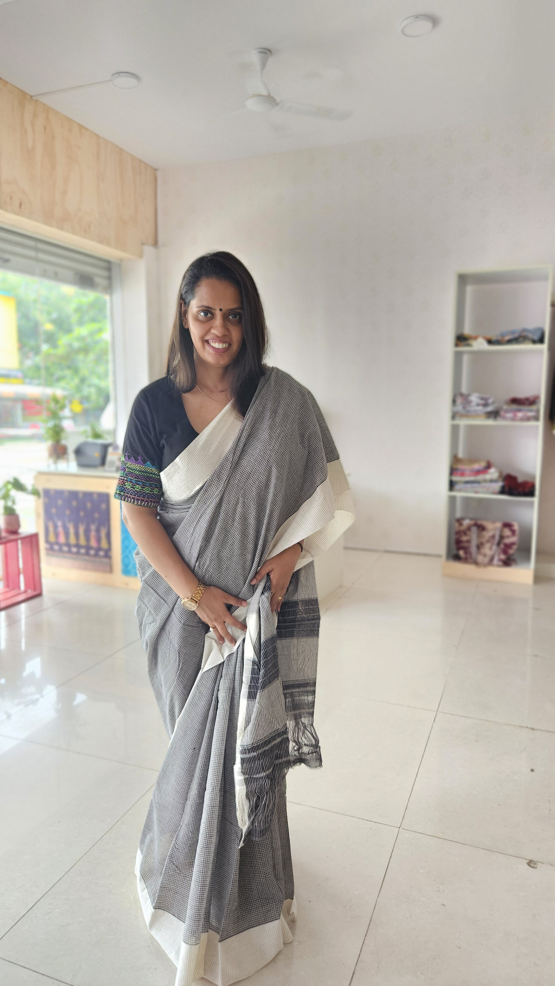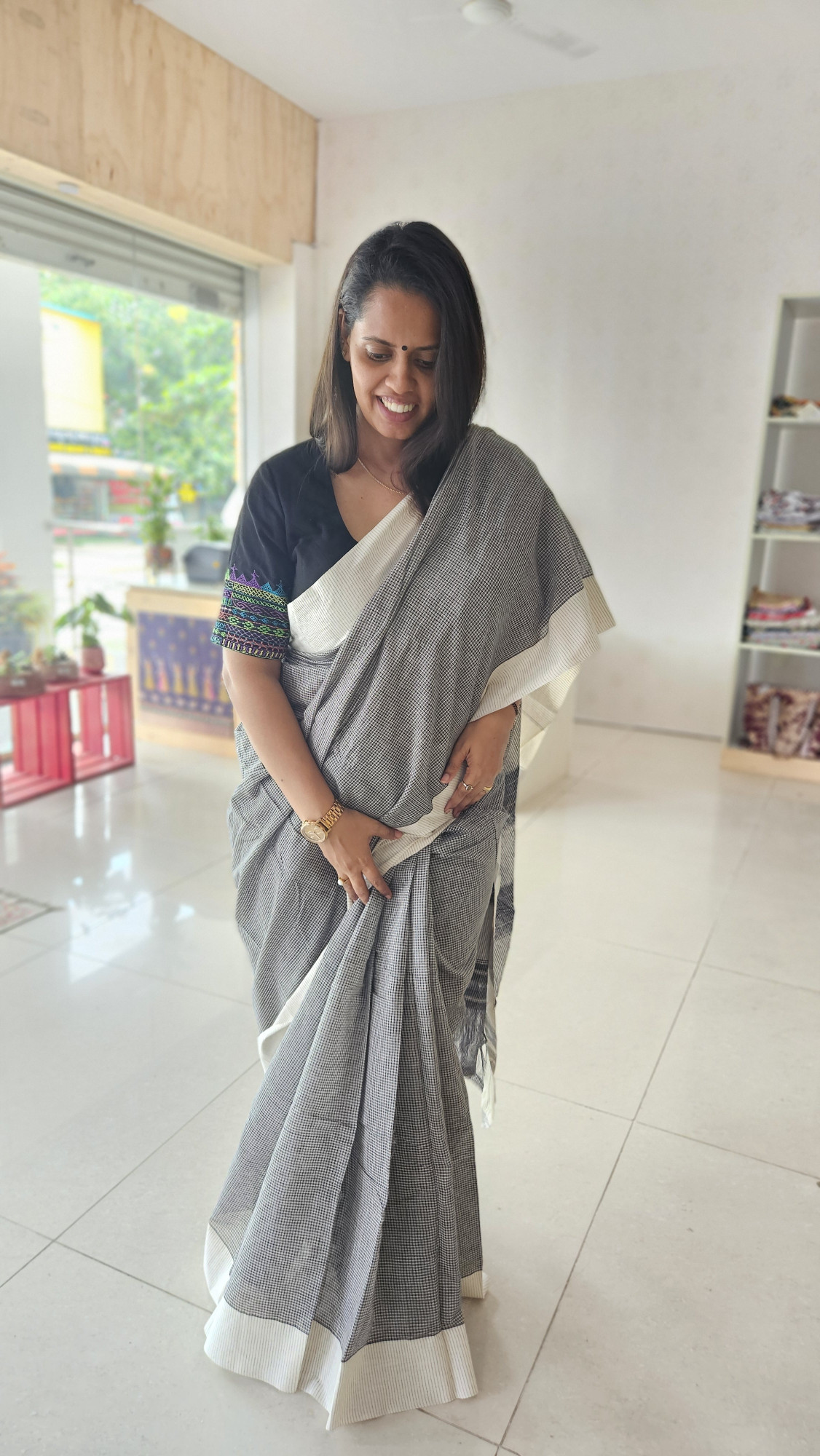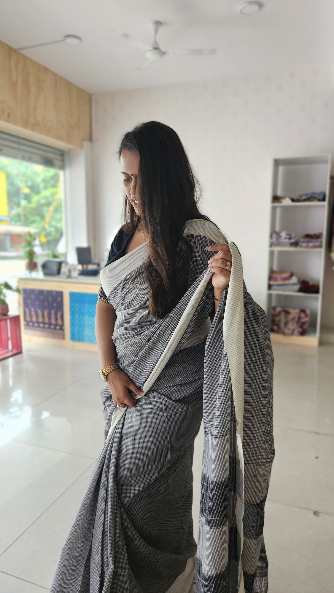 BLACK CHECKS WITH OFFWHITE BORDER HANDWOVEN SOFT COTTON PATTEDA ANCHU SAREE.