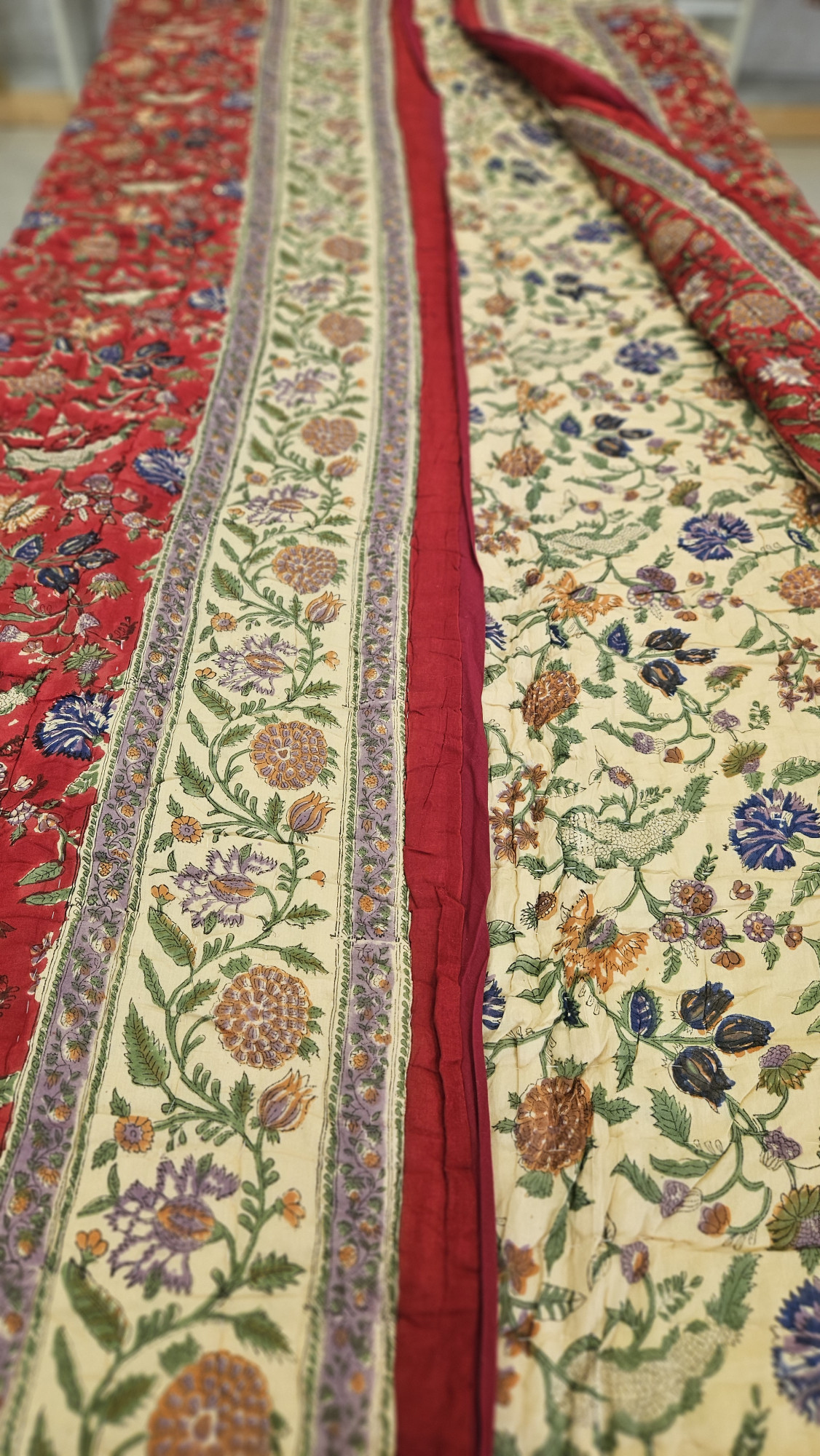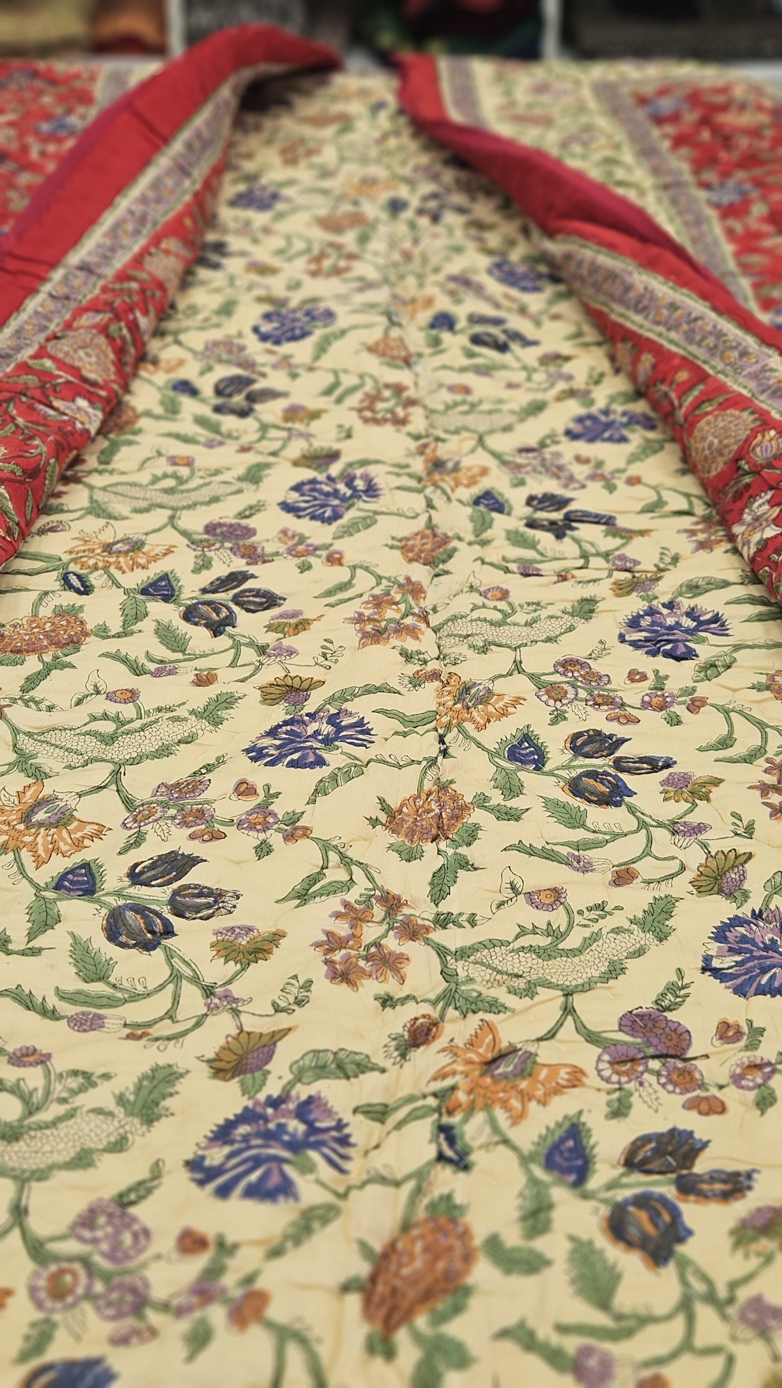 RED GARDEN BLOCK PRINT REVERSIBLE DOUBLE BED QUILT.