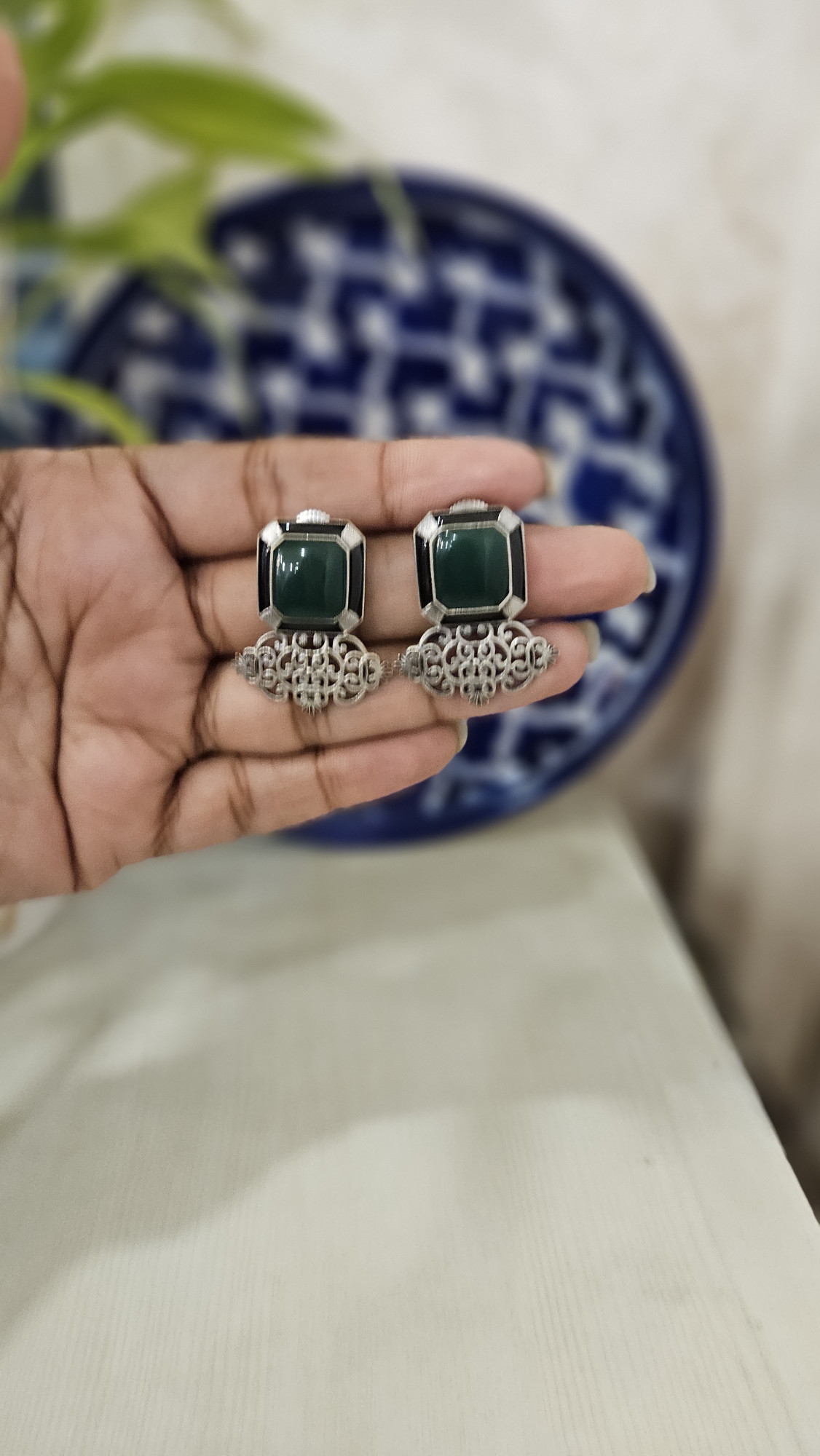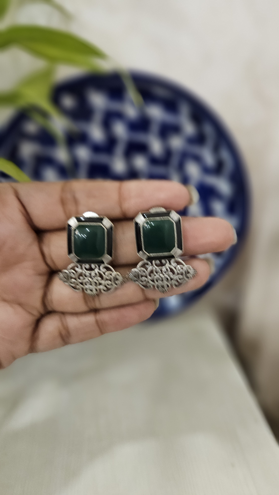 Green stone silver lookalike everyday wear stud