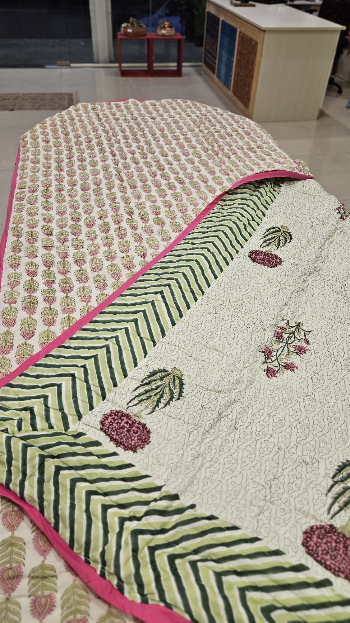 WHITE FLORAL BOOTI HANDBLOCK PRINT REVERSIBLE SINGLE BED QUILT.